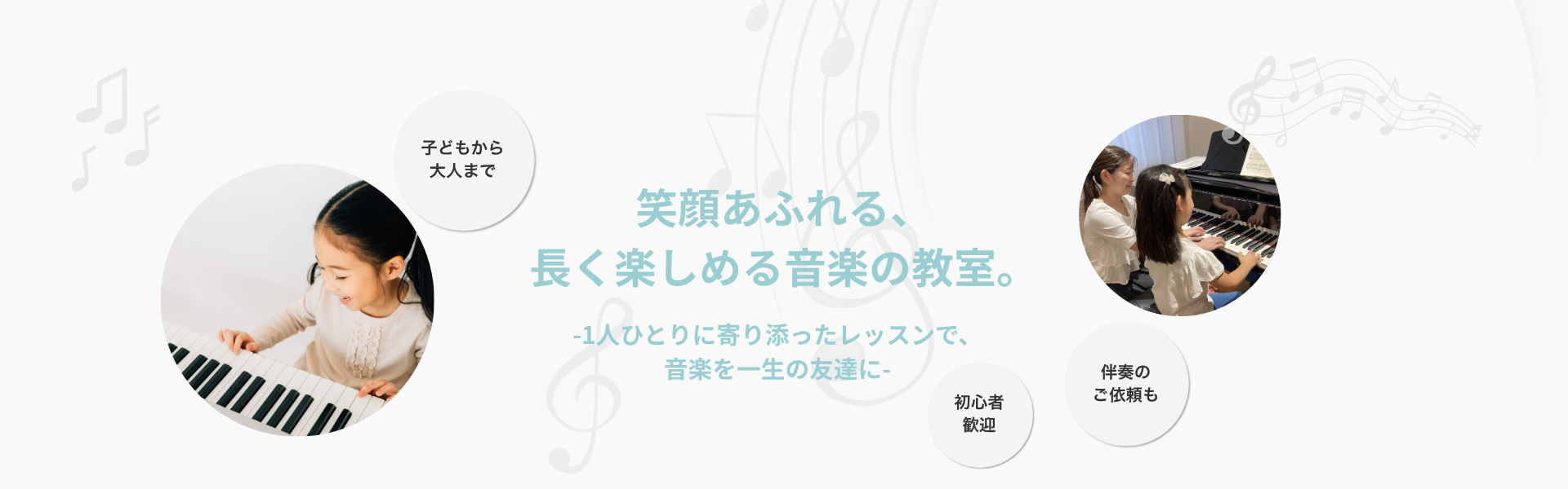 子どもから大人まで、一人ひとりに寄り添うピアノ教室です。音楽が一生の友達になるように、やさしく丁寧に指導しています。